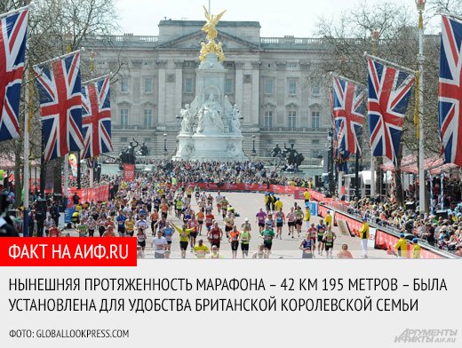 Именно на Олимпиаде 1908 года протяженность марафона составила нынешние 42 километра 195 метров. Дело в том, что на первых Олимпиадах эта дистанция не была четко регламентирована. На первой Олимпиаде 1896 года в Афинах дистанция проходила от местечка Марафон до столицы Греции, то есть повторяла маршрут который преодолел греческий воин по имени Фидиппид, по легенде принесший в Афины новость о победе в битве над персами. Правда, воин бежал «всего» 34,5 км, а спортсменам организаторы увеличили трассу до 40 км.
