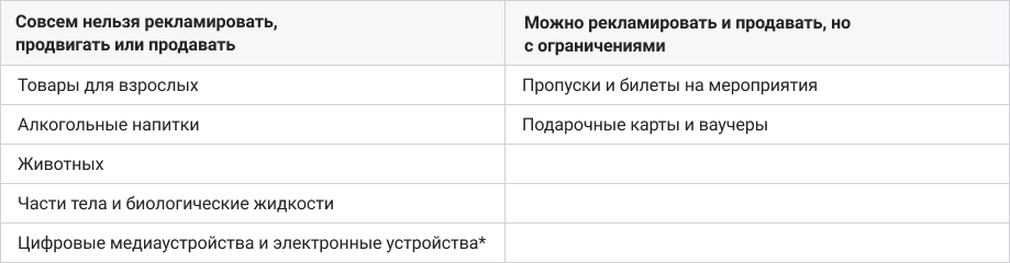 Например, нельзя рекламировать и продавать табак и изделия для него, а также рецептурные лекарства, наркотики и устройства для прослушки.