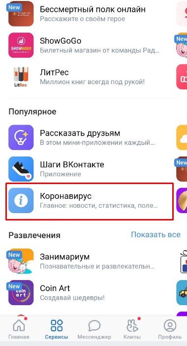 - Из открывшегося списка выберите «Коронавирус». Его трудно не заметить. Это значок светло-голубого цвета с латинской буквой «i» в центре;