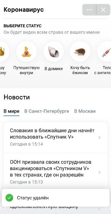 Установить можно было такой статус из раздела «Covid-19» или позже «Коронавирус» из главного меню ВК.