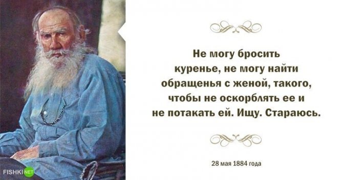 «Кажется, что в этот день я звал жену, и она, с холодной злостью и желанием сделать больно, отказала. Я не спал всю ночь. И ночью собрался уехать, уложился и пошел разбудить ее. Не знаю, что со мной было: желчь, похоть, нравственная измученность, но я страдал ужасно. Она встала, я все ей высказал, высказал, что она перестала быть женой. Помощница мужу? Она уже давно не помогает, а мешает. Мать детей? Она не хочет ею быть. Кормилица? Она не хочет. Подруга ночей. И из этого она делает заманку и игрушку», — запись от 14 июля 1884 года.