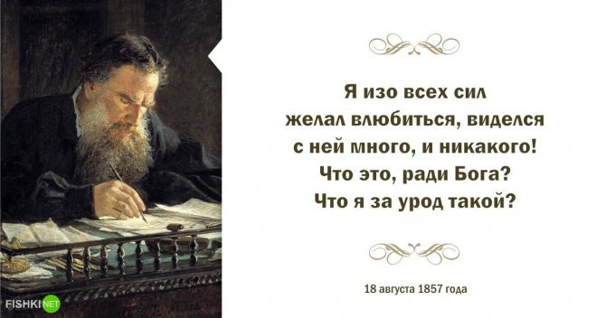 У ЛН было два состояния души: «истинно мудрый и хороший человек» и «слабое, жалкое существо». «Отлично жить на свете хорошим людям, — даже и таким, как я, хорошо бывает», — запись 14 апреля 1858 года.
