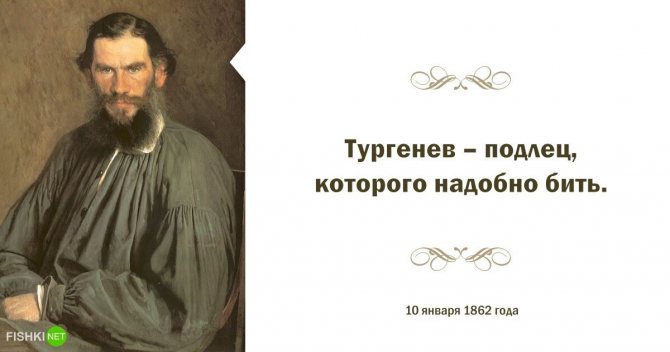 8 апреля 1857 года Толстой пишет: «Проснулся в 8, заехал к Тургеневу. Оба раза, прощаясь с ним, я, уйдя от него, плакал о чем-то. Я его очень люблю. Он сделал и делает из меня другого человека». А это отрывок из письма Фету от 25 июня 1861: «Замечательная ссора с Тургеневым; окончательная — он подлец совершенный, но я думаю, что со временем не выдержу и прощу его». Толстой с Тургеневым то любили друг друга, то ссорились (однажды даже чуть не случилось дуэли между двумя классиками), то критиковали, то хвалили. Они были слишком разными и никак не могли сойтись характерами.