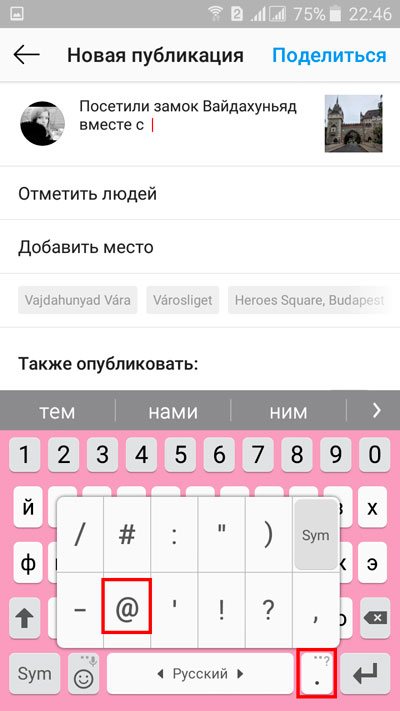 Описывая фото, мы можем добавлять ссылки на аккаунты других пользователей. Для этого необходимо в подписи поставить «@», а затем ввести первые буквы названия аккаунта человека, которого хотим упомянуть.