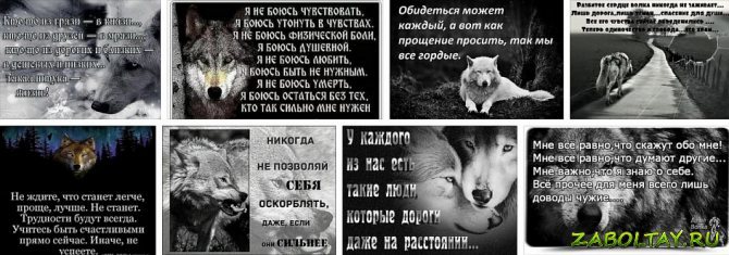 Статусы про волков по душе всем, кто по жизни «одиночка», тому, кто чувствует себя настороженно и уже не раз был обижен на жизнь. В статусах о сером хищнике люди приписывают себе повадки этого зверя, проводят параллель между ними и своим видением этого мира и человеческих взаимоотношений. Такие статусы ценят за правдивость и смелость, они будто бросают вызов обществу из уст того, кто обрек себя на одиночество вольно или невольно.